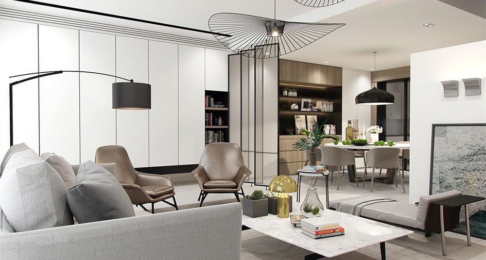 在这个设计案例中,整个室内以白色为主色调,黑色和灰色作为辅助色调,营造出一种高雅、现代感强烈的氛围。清晰利落的线条、简洁的家具、简约的布局,使空间显得宽敞、整洁。大面积的白色墙面、地板和天花板与黑色和灰色的家具、装饰品相得益彰,形成了鲜明的对比。同时,黑白灰的色调还赋予了空间一种冷静、安静的感觉。